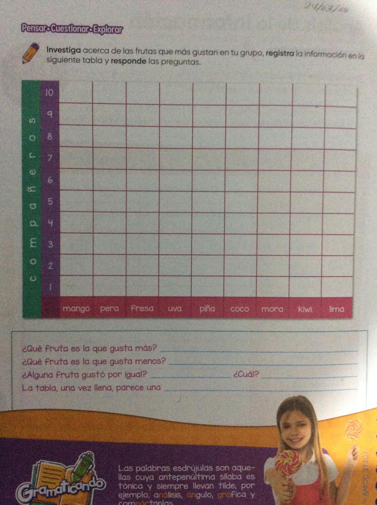 - Trabajaremos con tu libro Activa en la página 28, te pido leas las indicaciones, por el periodo de contingencia no es posible graficar las frutas que más les gusten a tus compañeros, por tal motivo te pido la llenes con la información que te proporcione cada uno de tus miembros familiares.