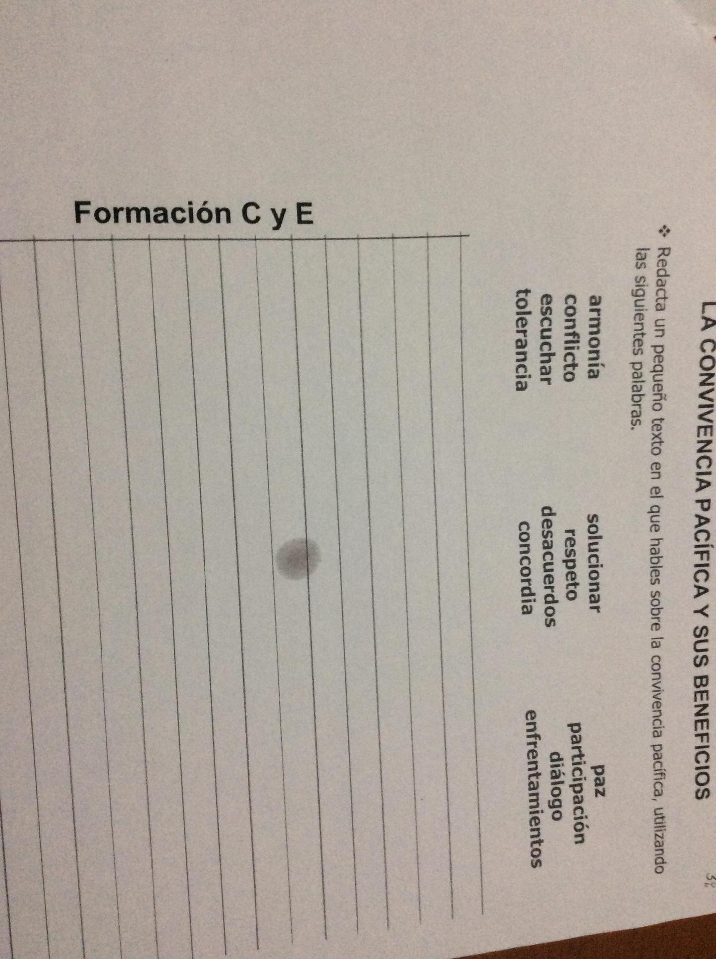 - Localiza tu hoja complementaria “La convivencia política y sus beneficios”, redacta un pequeño texto utilizando las siguientes palabras: Armonía, conflicto, escuchar, tolerancia, solucionar, respeto, desacuerdo, concordia, paz, participación, dialogo y enfrentamientos.