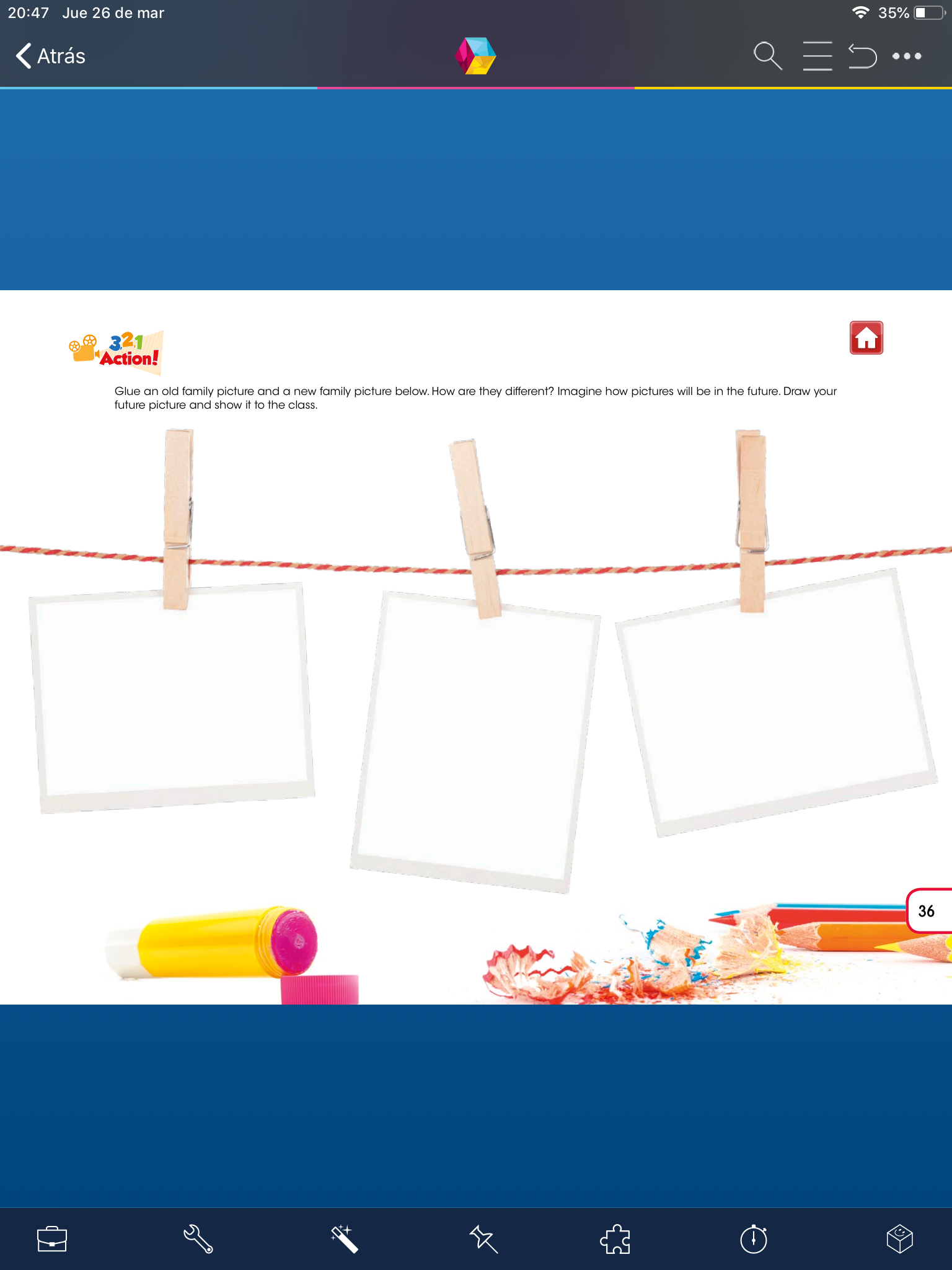 - Ahora sí viene lo divertido en esta actividad, en la pagina 36 primero pega la copia de una foto con tu familia en donde aparezcas cuando eras más pequeño, en el segundo cuadro pondrás una copia de una foto de la actualidad con tu familia y en el último recuadro dibuja y colorea como crees que se verían tú y tu familia en el futuro.