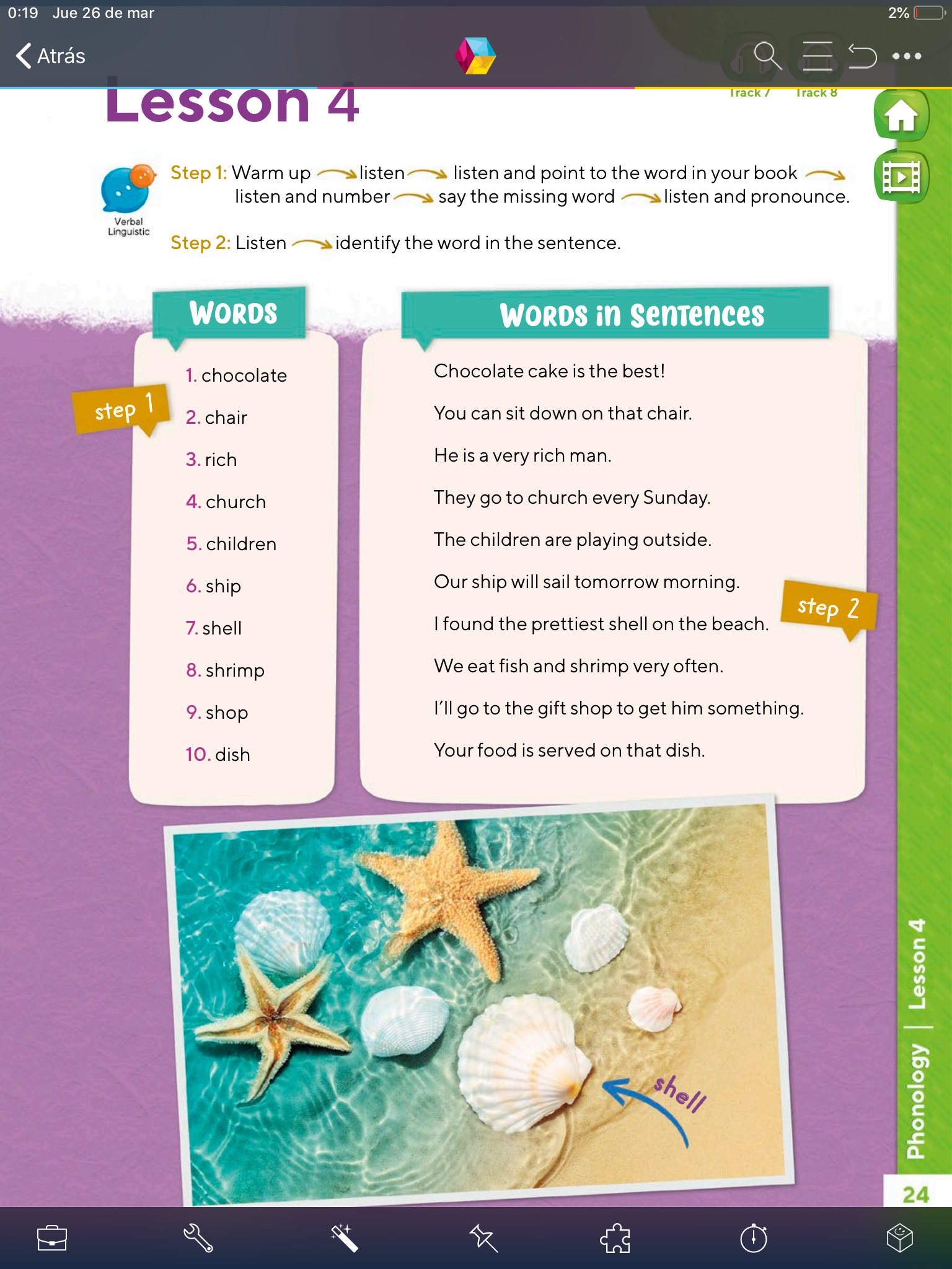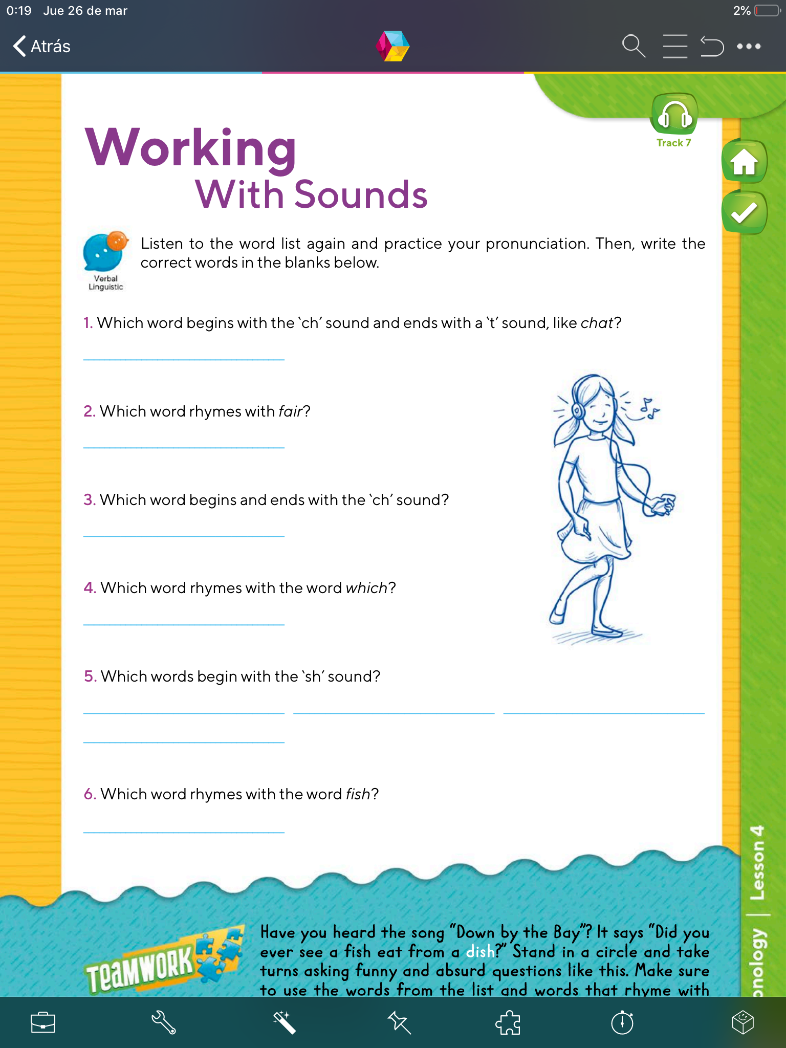 - En esta página (p.25) escucha nuevamente el audio (TRACK 7), luego escribe las palabras que correspondan al sonido que te pide en la línea.