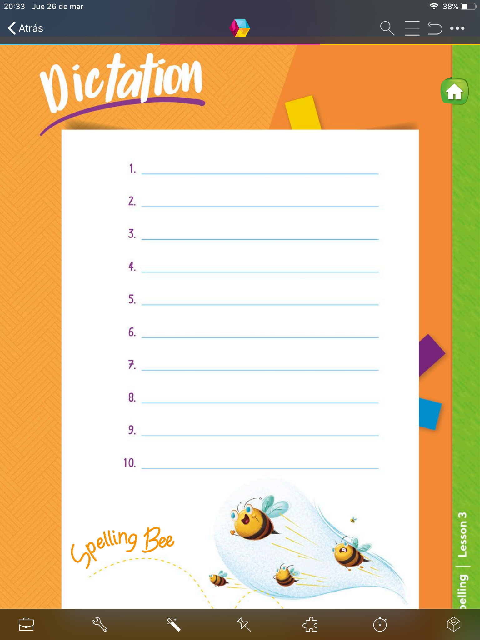 - Abre tu libro en la página 23, ¿recuerdas qué día es hoy?… Es viernes y ¿qué actividad nos toca realizar, lo recuerdas? ¡Sí! Dictation, ¿estás listo para escribir las palabras? (Escucha en el video el Dictation) comencemos..