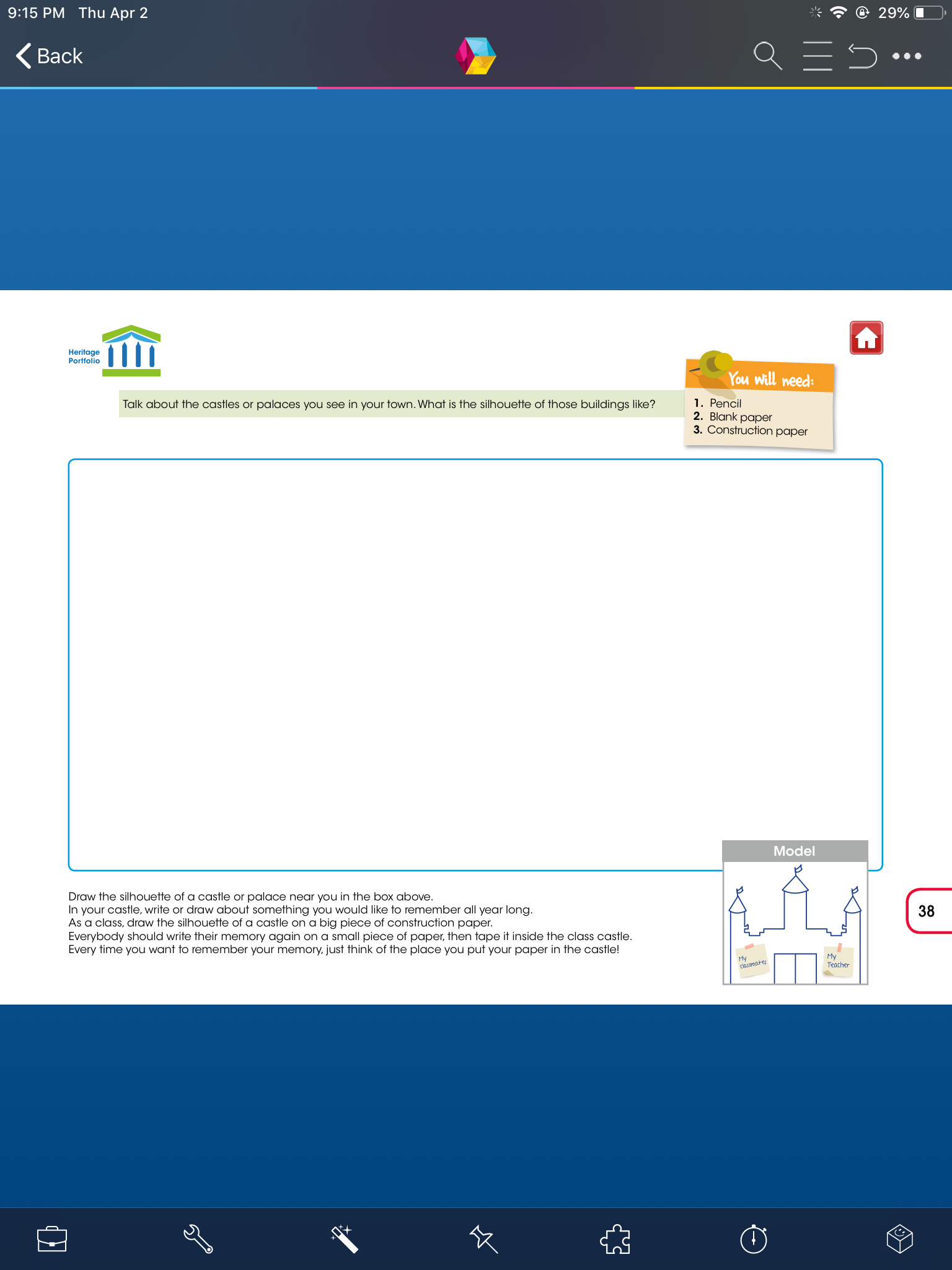 - Pasa a la siguiente página y dibuja un castillo o palacio que hayas visitado, utiliza colores o plumones. (Si no has visitado ningún castillo, dibuja un castillo de la manera en la que lo imaginas)