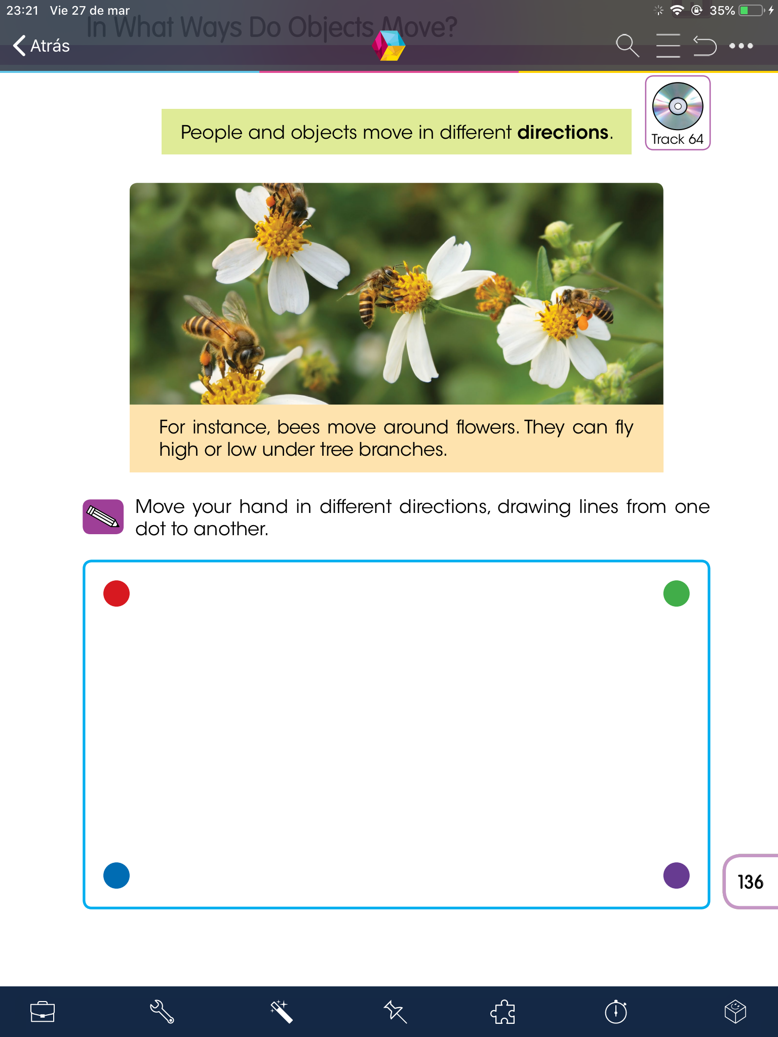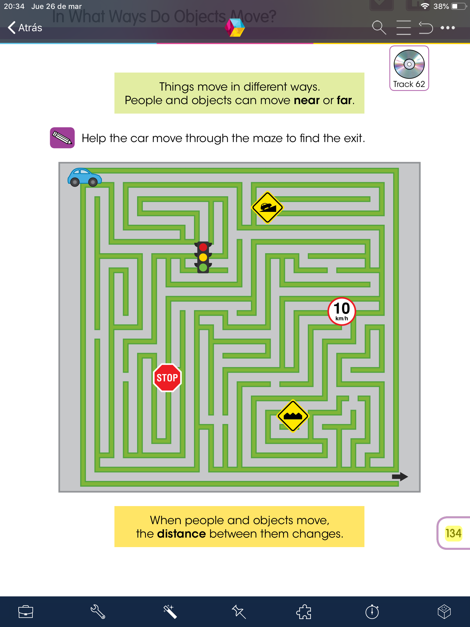 - Abre tu libro de knowledge en la página 134, observa la imagen, escucha el audio (track 62), después de eso con un objeto pequeño como ficha o carro haz el recorrido que debe llevar el carro hasta donde está la salida, una vez que hayas encontrado el camino síguelo nuevamente y marcalo con color.
