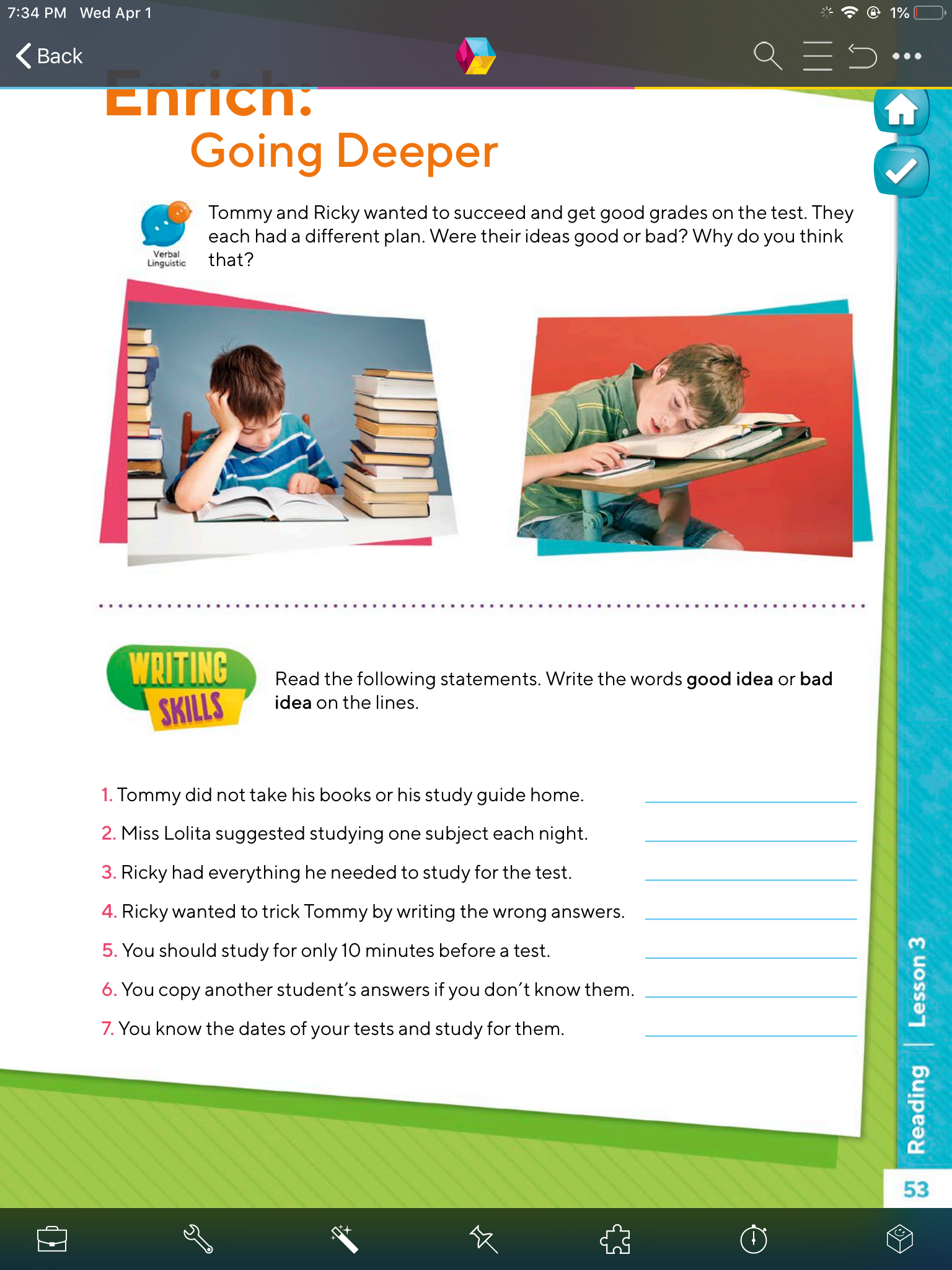 - Ahora pasaremos a la página 53 y quiero que observes las imágenes donde están Tommy y Ricky, cada uno tuvo una idea para tener éxito en el examen, en la parte de abajo de cada imagen debes poner “GOOD” o “BAD” depende de lo que tú creas que fue buena o mala idea, según lo que hizo cada uno para poder pasar su examen.