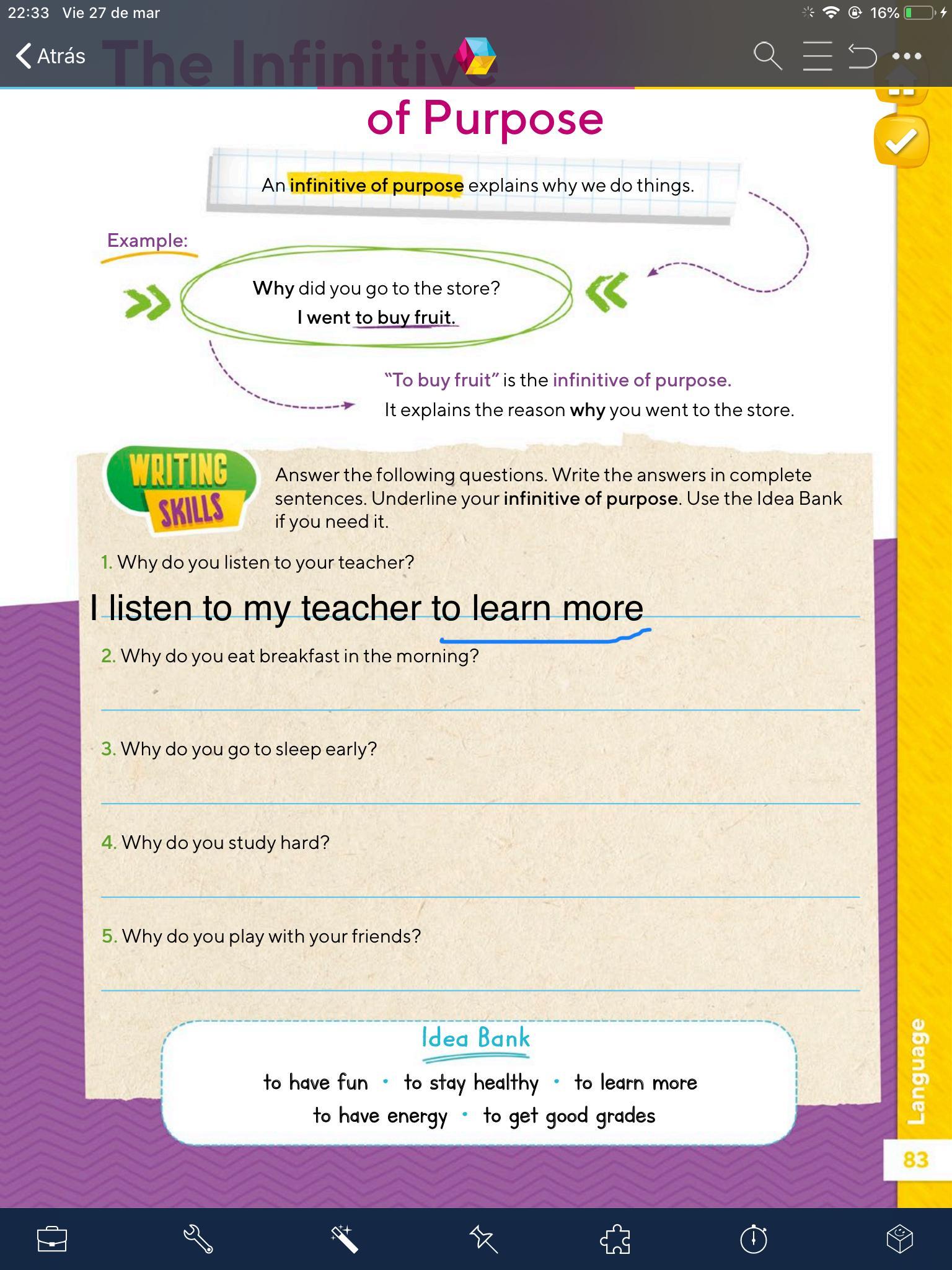 - Completaras las oraciones utilizando las palabras del cuadro si es necesario(Idea Bank)