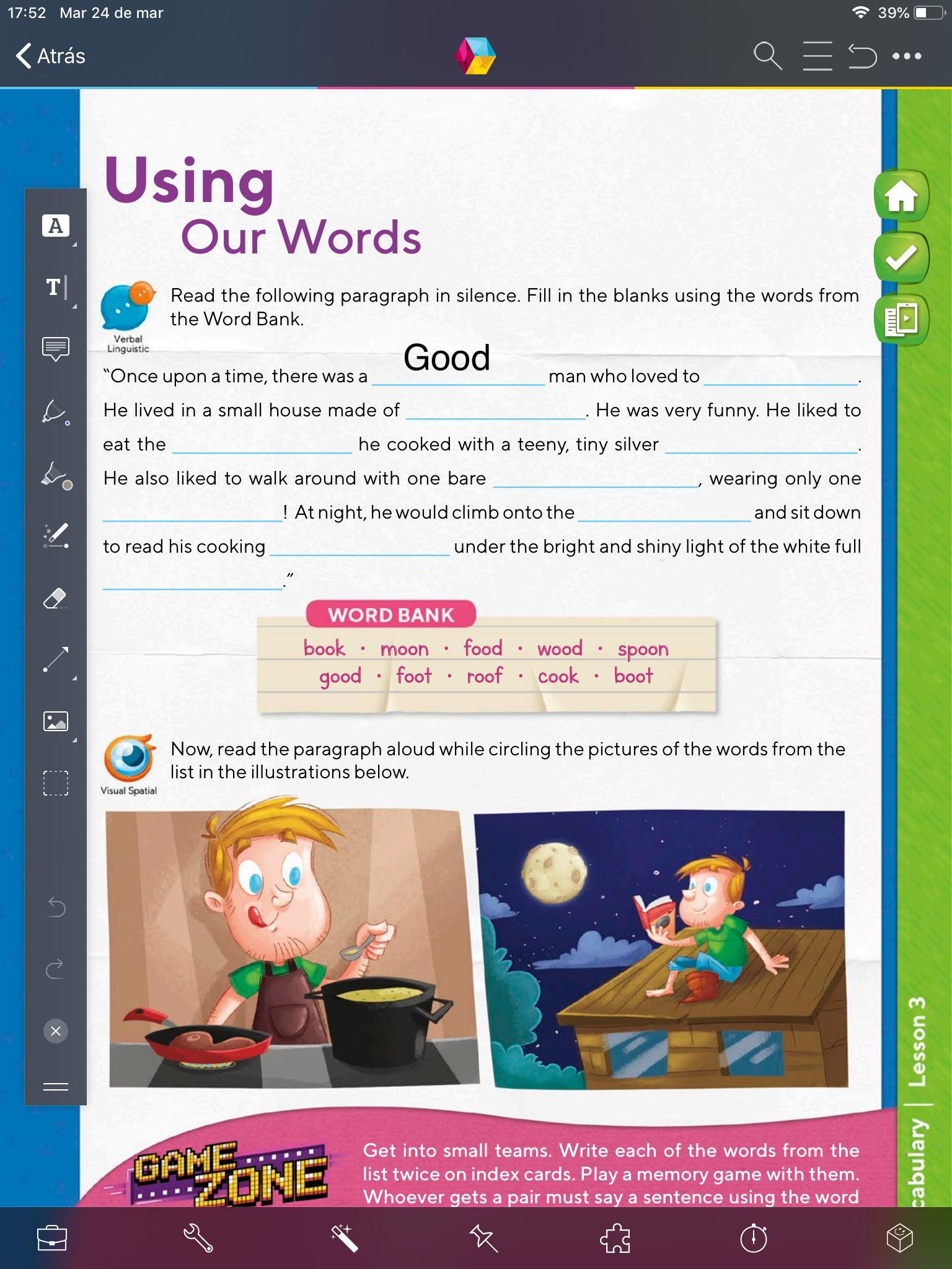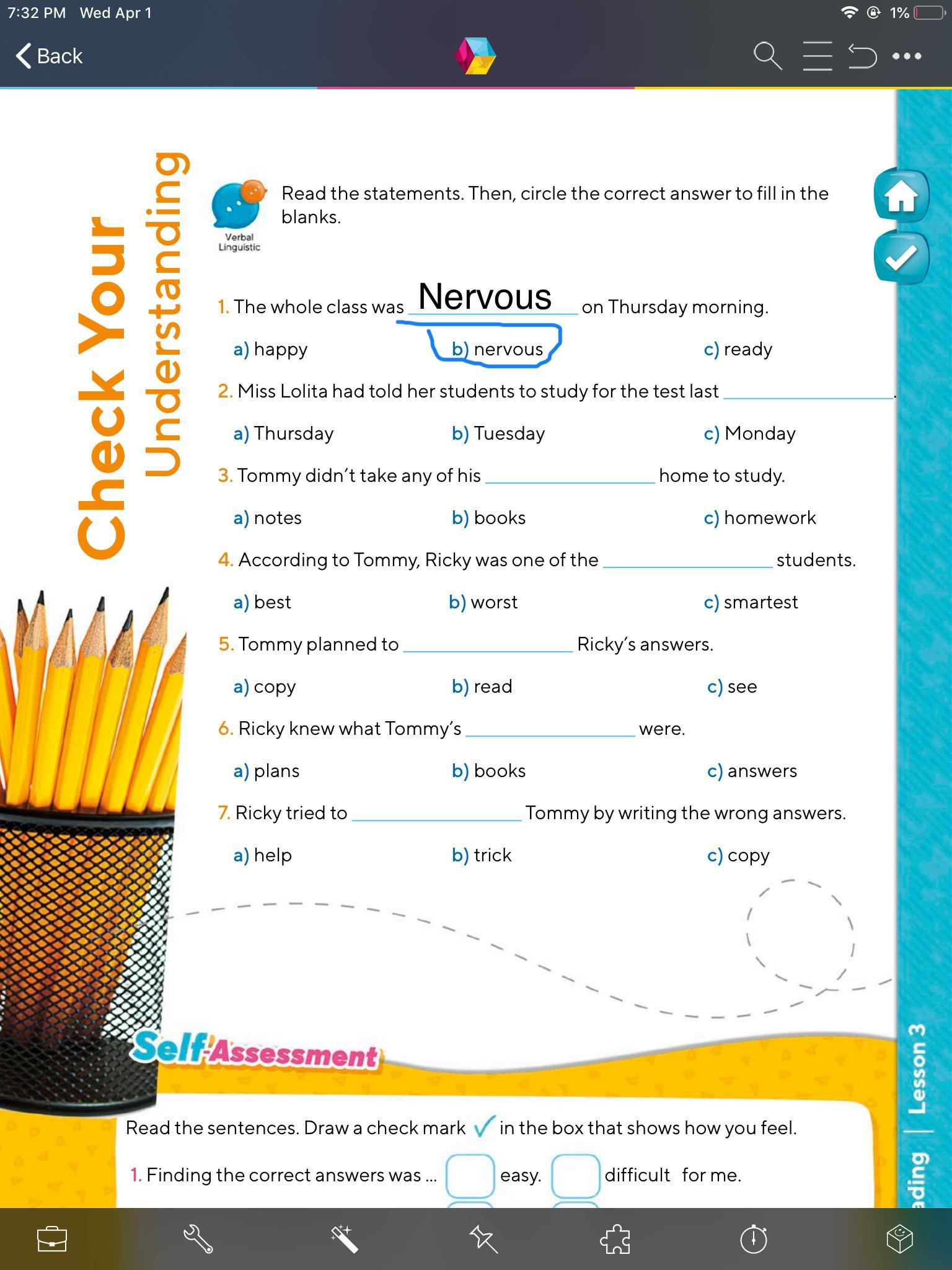 - Abre tu libro en la página 52, lee las oraciones y encierra en un círculo la respuesta correcta para completar los espacios en blanco.