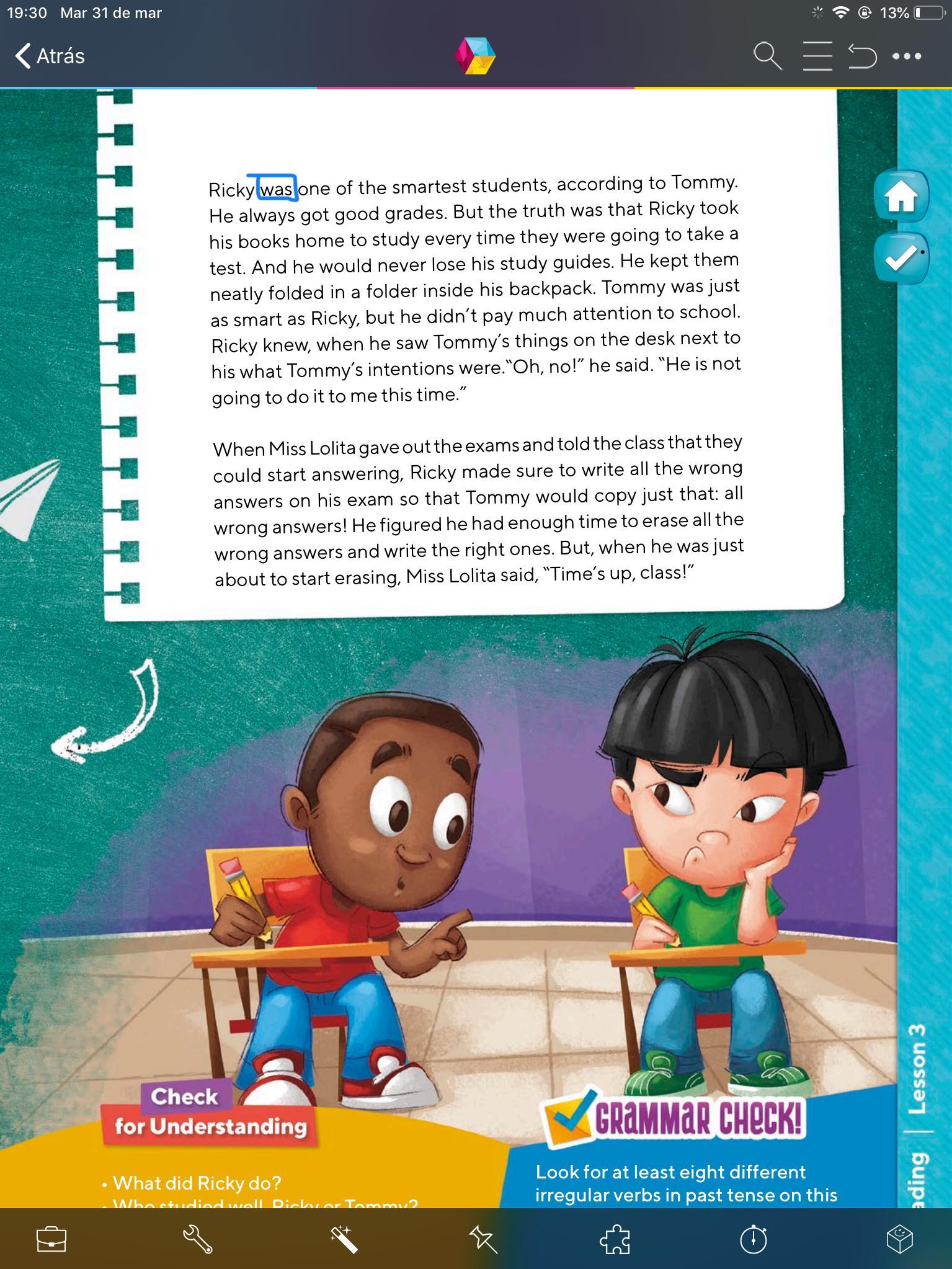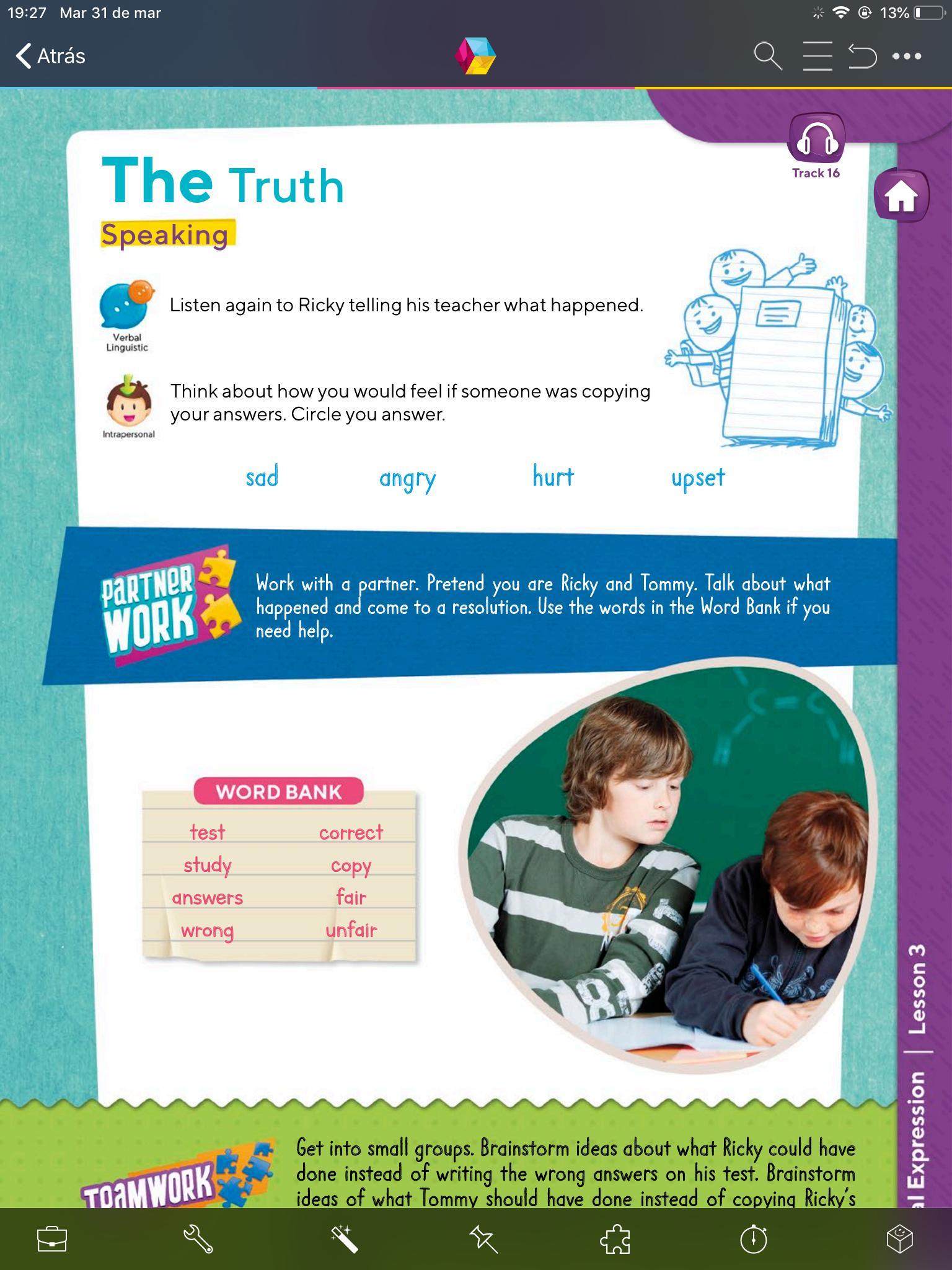 - En esta actividad vamos a escuchar nuevamente lo que Ricky le dice a su maestra sobre lo que sucedió. (track 16)