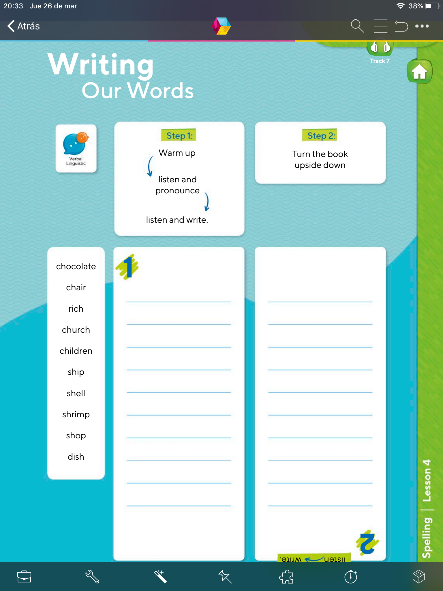 - Una vez que hayas terminado dale vuelta a tu libro y reproduce el audio nuevamente (track 7) para escribirlas en las líneas de la segunda columna.
