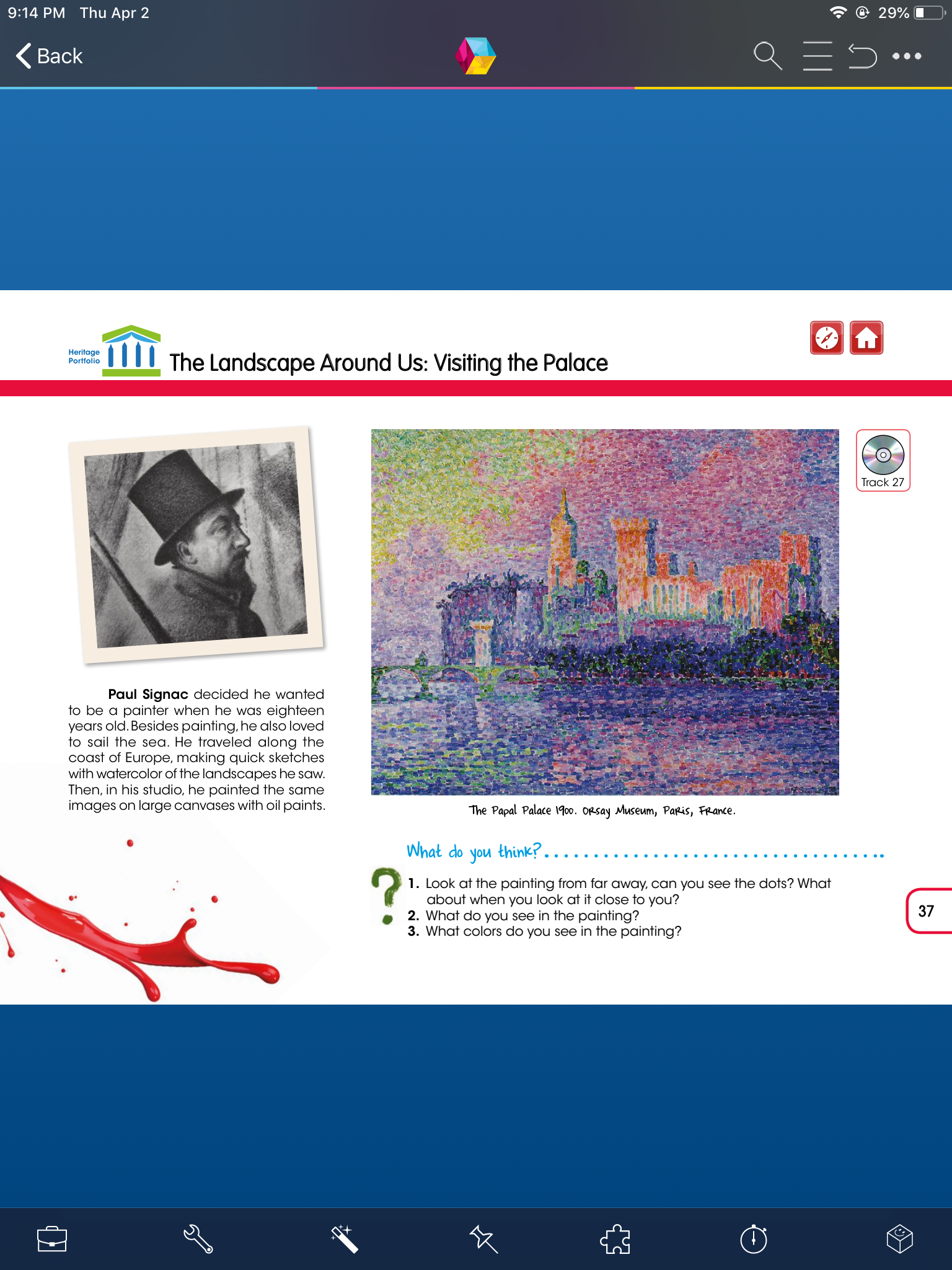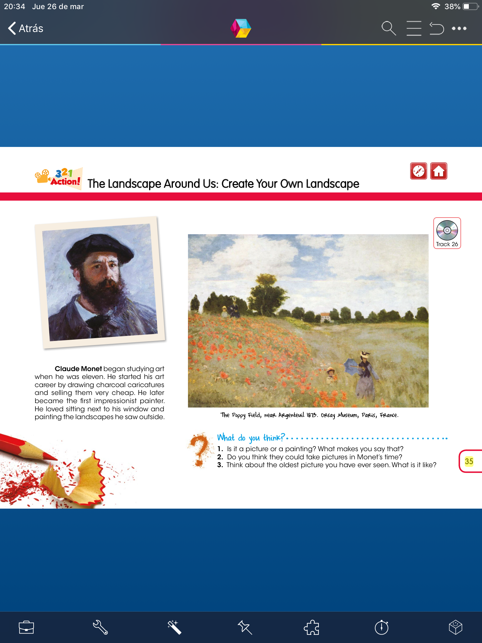 - Abre tu libro the Arts en la página 35, escucha el audio (track 26), en esta actividad leerás el pequeño texto que viene aquí y la seguirás la lectura con tu dedo, al finalizar tienes 3 preguntas que puedes responder con lo que entendiste en el audio, si es necesario escucha la lectura nuevamente.