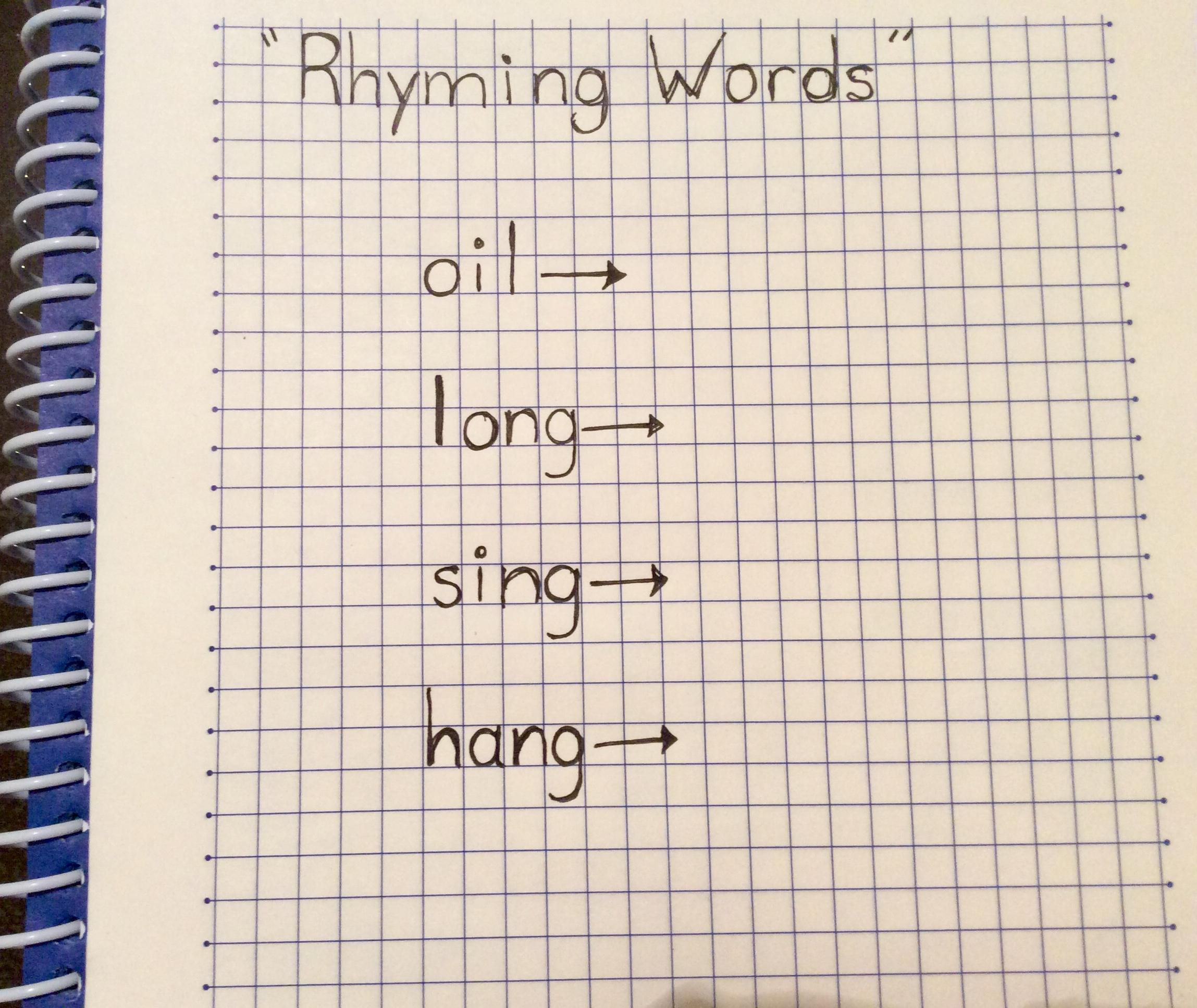 - Después de observar el video, abrir su cuaderno, escribir las primeras cuatro palabras de las que se muestran en el video (oil, long, sing, hang) buscar solo una palabra que rime con cada palabra. Escribiendo como titulo “Rhyming Words” les adjunto la imagen Rhyming Words como ejemplo del ejercicio. https://3.files.edl.io/3580/20/03/22/164235-86128c11-0d8c-4307-ab3e-0d1fec2aea4f.jpeg
