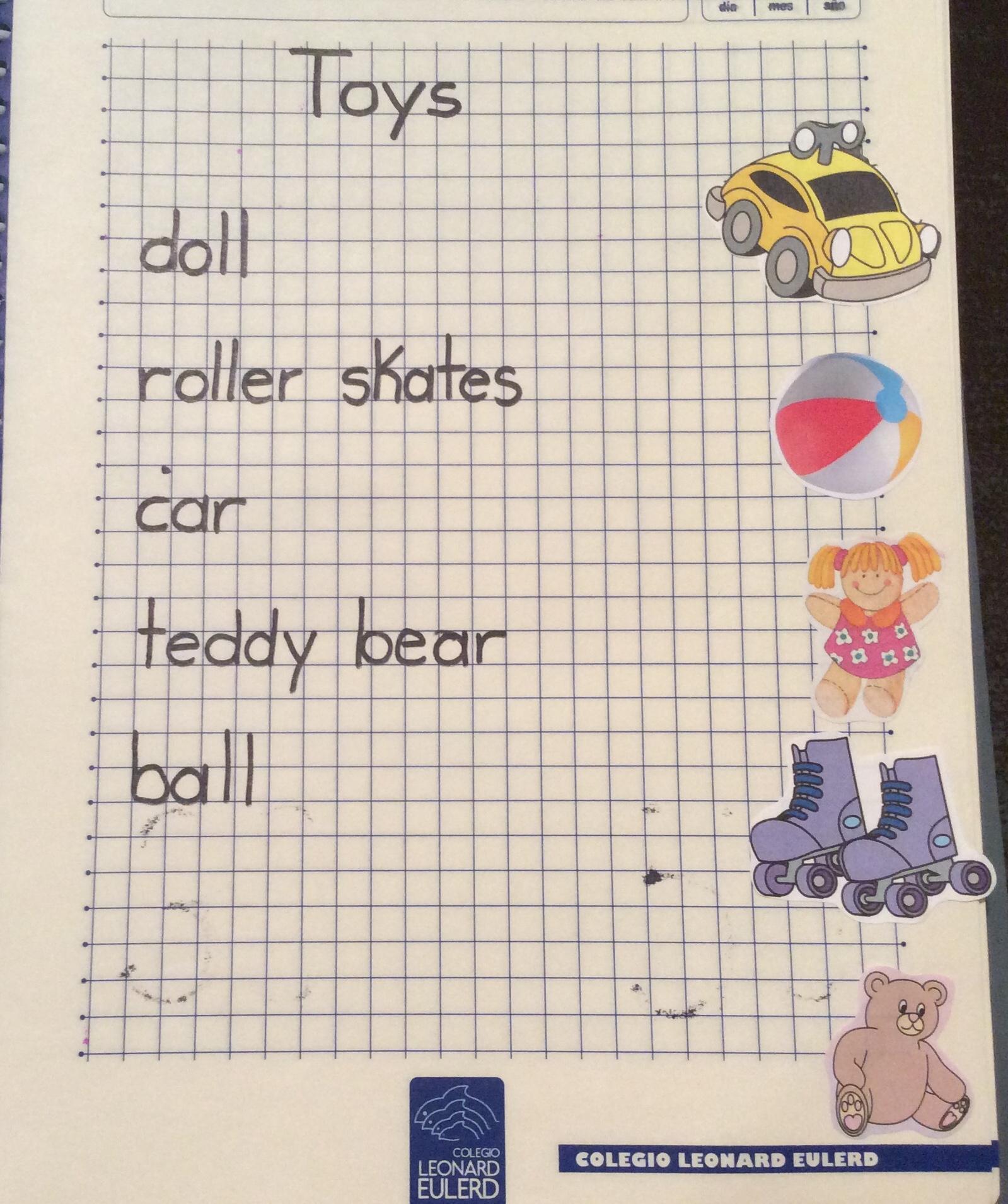 4. Busca los recortes de los 5 juguetes que escribiste en tu cuaderno y pegalos en forma desordenada a la lista de palabras. Te adjunto la imagen “Matching Toys” como ejemplo.