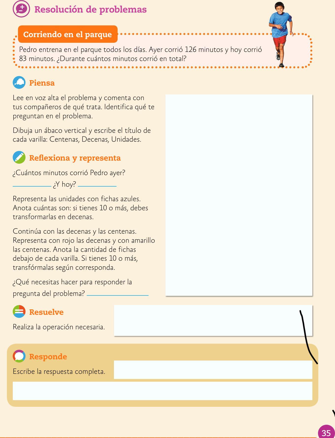 · En la siguiente página 35, da lectura al problema que se te presenta, piensa, reflexiona, representa, resuelve y responde.