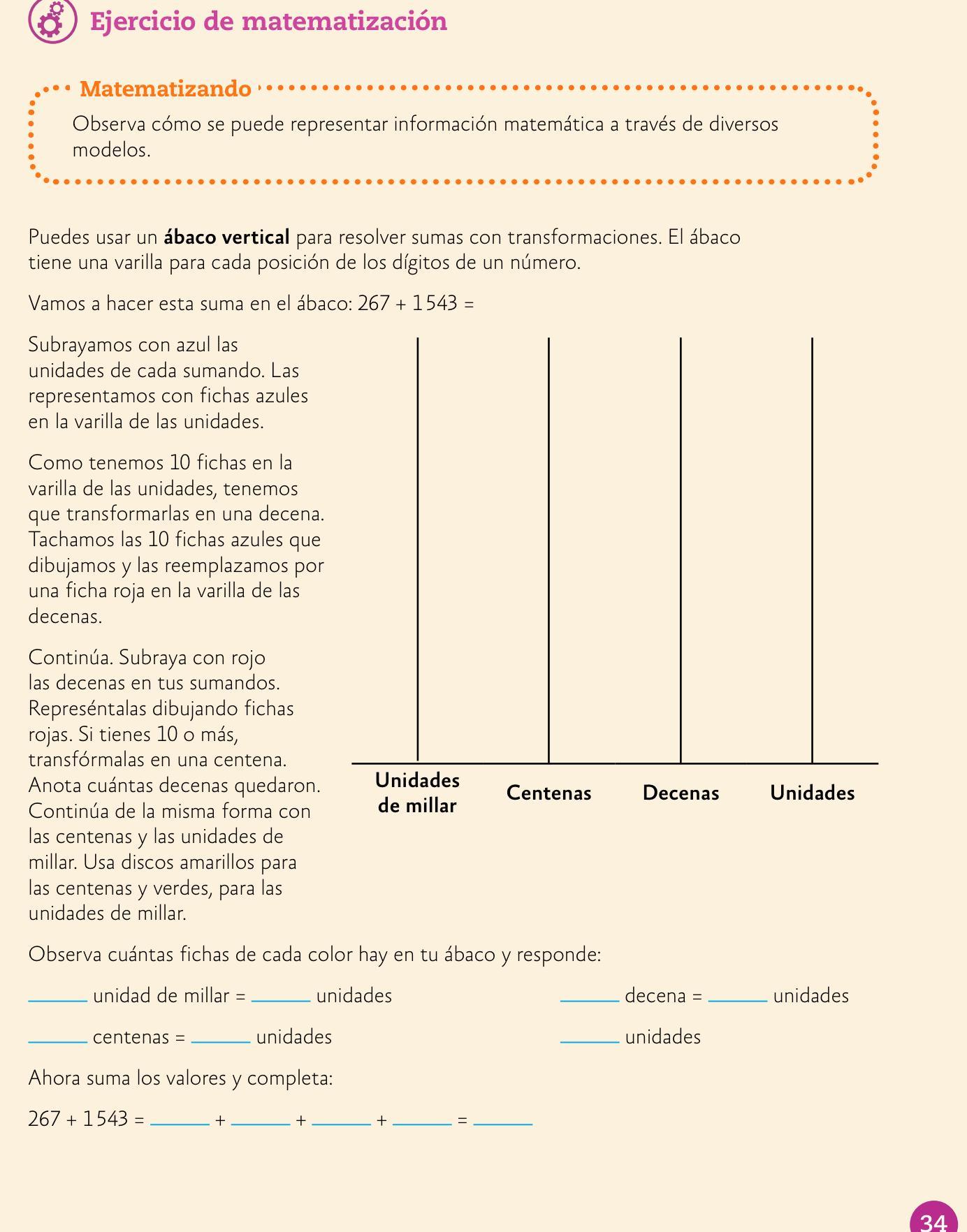 · En tu libro de comprensión matemática página 34, realiza una suma, acomodando los valores posicionales, observa cuántas fichas hay de cada color y contesta.